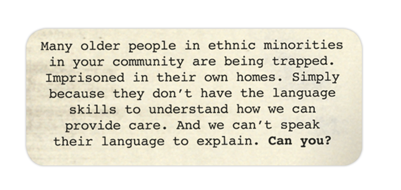 The ‘Trapped Voices’ campaign asked ‘can you help?’ in different languages and attracted bilingual carers who could give vulnerable people their voice back and get them any help they need.